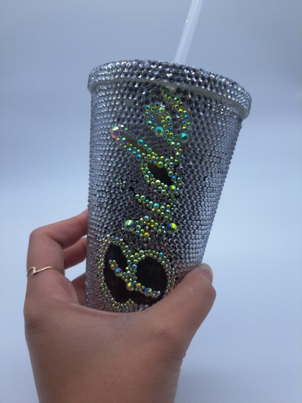 Vaso full strass con tu nombre + tapa full strass + detalle abajo en el vaso!